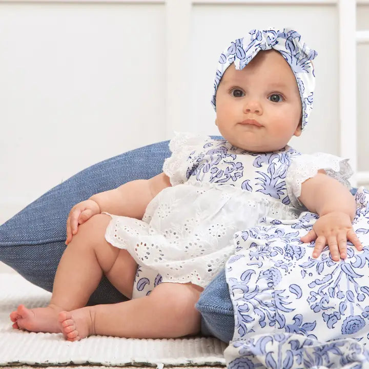 Ultra soft bodysuit made of bamboo/cotton/spandex blend jersey. Has a 100% cotton eyelet lace skirt and flutter sleeves. Baby will look cute and feel comfy in our absorbent, hypoallergenic, eco-friendly, and sweat-resistant style. Buttons at the back of the neck and snaps underneath for easy on and off.